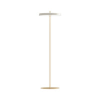 The LED panel is dimmable and has a white diffuser ensuring a soft illumination in the surrounding space. The brass stem going through the floor lamp as a vertical axis, reinforces a tight expression and by turning the top part of the stem you easily turn the light on and off.