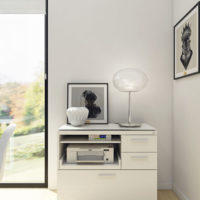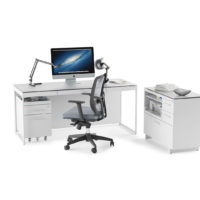 All of the office storage you need in one cabinet. The BDI Centro 6417 Multifunction Cabinet provides functional and efficient storage for your office. Two storage drawers, one large file drawer, an adjustable shelf and a pull-out tray for your printer cover all of your needs. Locking drawers keep your belongings safe. The file drawer accommodates both letter and legal sized files. A light grey etched top contrasts subtly with the satin white frame and base. The micro-etched grey glass top provides a durable work surface that resists scratches and watermarks. It also makes a great writing surface and is compatible with optical mouses. The cabinet is made of a satin white painted hardwood veneer. White powder coated steel legs subtly support the cabinet.