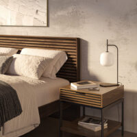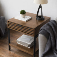 A slim drawer pull grants effortless access to a full-depth drawer while maintaining a sleek and minimalist profile. Beautiful solid wood slats, powder-coated steel legs, and a lower display/storage shelf round out the attractive design.