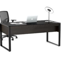 A micro-etched grey glass top provides a durable work surface that resists scratches and watermarks. It also makes a great writing surface and is compatible with optical mouses. A satin white painted real wood veneer and powder coated steel frame support the glass top.