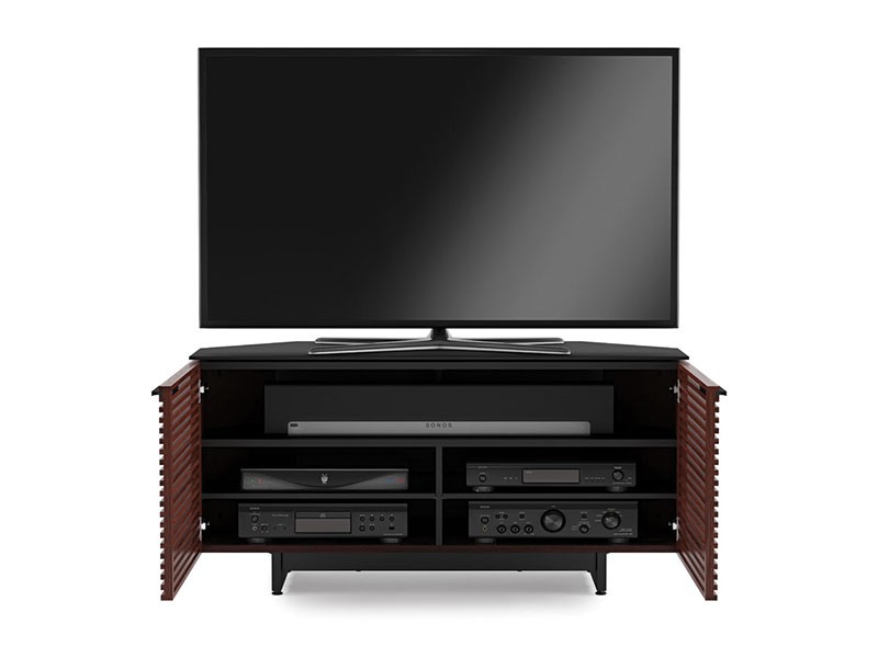 The Corridor 8175 Corner Media Cabinet from BDI features a striking louvered facade made of solid wood. The wood front conceals your components while allowing the signal from a remote control to pass through the doors. This unit is designed to hold a sound bar, along with a number of other components. Angled back corners allow this media cabinet to fit neatly into the corner of your room. This design also minimizes the amount of space consumed in the room and leaves no pesky corners to bump into.