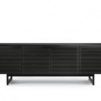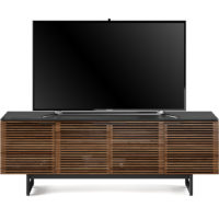 The Corridor 8179 Home Theater TV Cabinet from BDI features a striking louvered facade made of solid walnut. With an etched glass top and black steel legs, this piece is quite eye catching. This model is four compartments wide, and able to accommodate up to an 85″ TV. Choose from Chocolate Stained Walnut, Charcoal Stained Ash, or Natural Walnut.