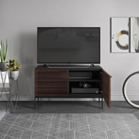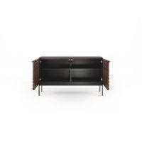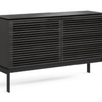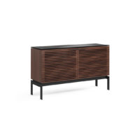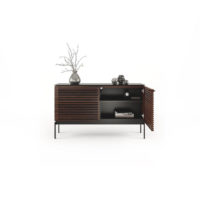 The Corridor SV 7128 Two-door Console from BDI features a striking louvered facade made of solid wood. The wood front conceals your components while allowing the signal from a remote control to pass through the doors. This unit is designed to hold a sound bar, along with other components. With an etched glass top and black steel legs, this piece is quite eye catching. This model is two compartments wide, and able to accommodate up to an 60″ TV. The Corridor SV has a slim profile of 15.75″, so it takes up minimal space in your room.