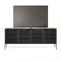 The Corridor SV 7129 Four-door Console from BDI features a striking louvered facade made of solid wood. The wood front conceals your components while allowing the signal from a remote control to pass through the doors. This unit is designed to hold a sound bar, along with 6-8 additional components. With an etched glass top and black steel legs, this piece is quite eye catching. This model is 79″ long, creating a dramatic look. It’s able to accommodate up to an 80″ TV. The Corridor SV has a slim profile of 15.5″, so it takes up minimal space in your room.