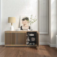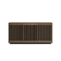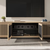Oak hardwood slatted doors beautifully conceal contents while providing ventilation, acoustic transparency, and remote control accessibility.