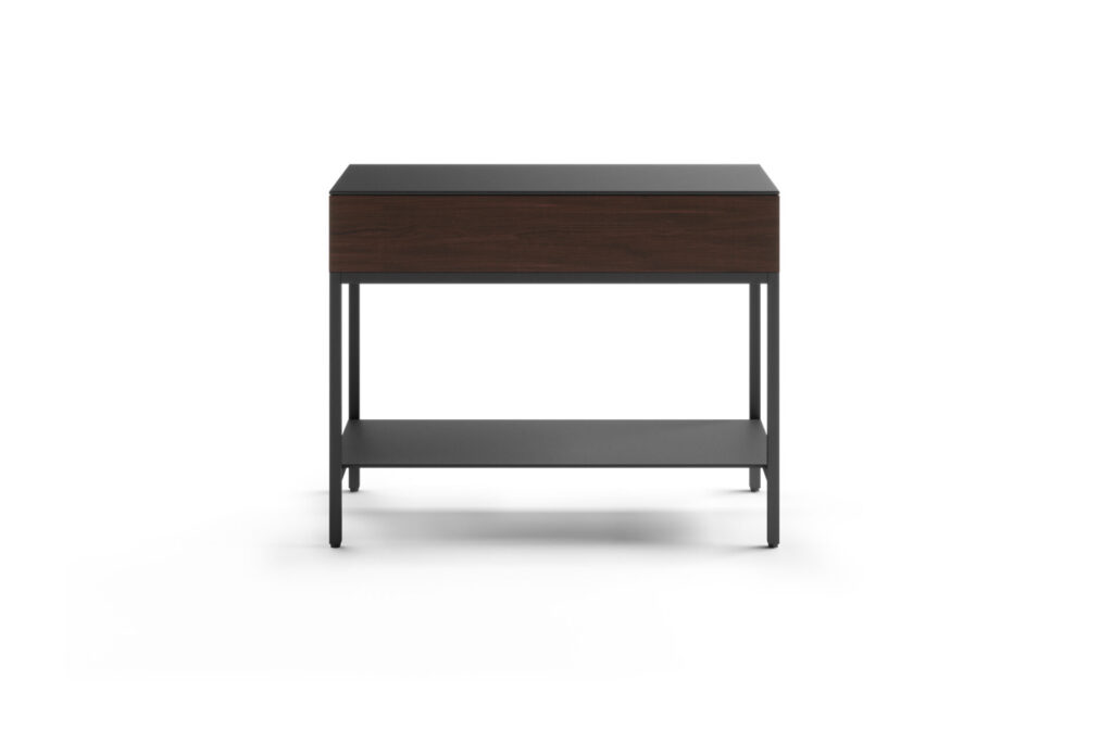 Top and lower display surfaces feature luxuriously smooth matte black satin-etched tempered glass. Accented by your choice of three wood finishes, the Reveal end table personifies timeless style.