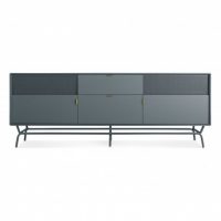 This entertainment console features a perforated steel door front, allowing easy use of remotes. Other features include brass details, a powder-coated steel base, leveling feet, and a painted oak or natural walnut body. This piece is sure to meet all of your entertainment needs with a modern aesthetic.