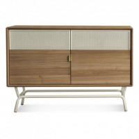A grey exterior and perforated steel give this media stand a modern, industrial look. Design elements like the brass handle and the perforated steel (which allows you to operate your components without opening the door) are well thought out. Leveling feet help to make sure your TV is level when your floor is not. The cabinet is painted oak or walnut veneer and the base is powder coated steel. Also available in as a 2 Drawer/2 Door Console or a 1 Door/3 Drawer Console.