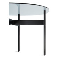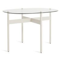 Oval and round glass tops get eye-catching support from a crisp architectural powder-coated steel base. The Flume table legs cleverly and unobtrusively attach through the tempered glass top to create an understated yet winsome detail. Round coffee table and swoval coffee table also available.