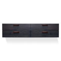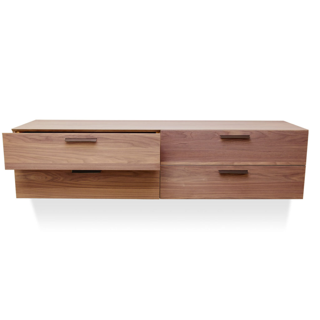 Designing case goods is hard. Functionally they always need to be big boxes with drawers and doors. With Shale we really focused on making a few special details. We mitered the front of the top panel and the top edge of the drawers or doors so there’s just a simple, single line at the top of the cabinet. We explored a lot of options for door and drawer pulls and decided on leather as way to bring in an unusual material that was pleasing to touch. The rest was all about getting the cabinets to the right proportions and then having some fun with the asymmetry of the doors and drawers on some of the cases.