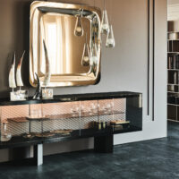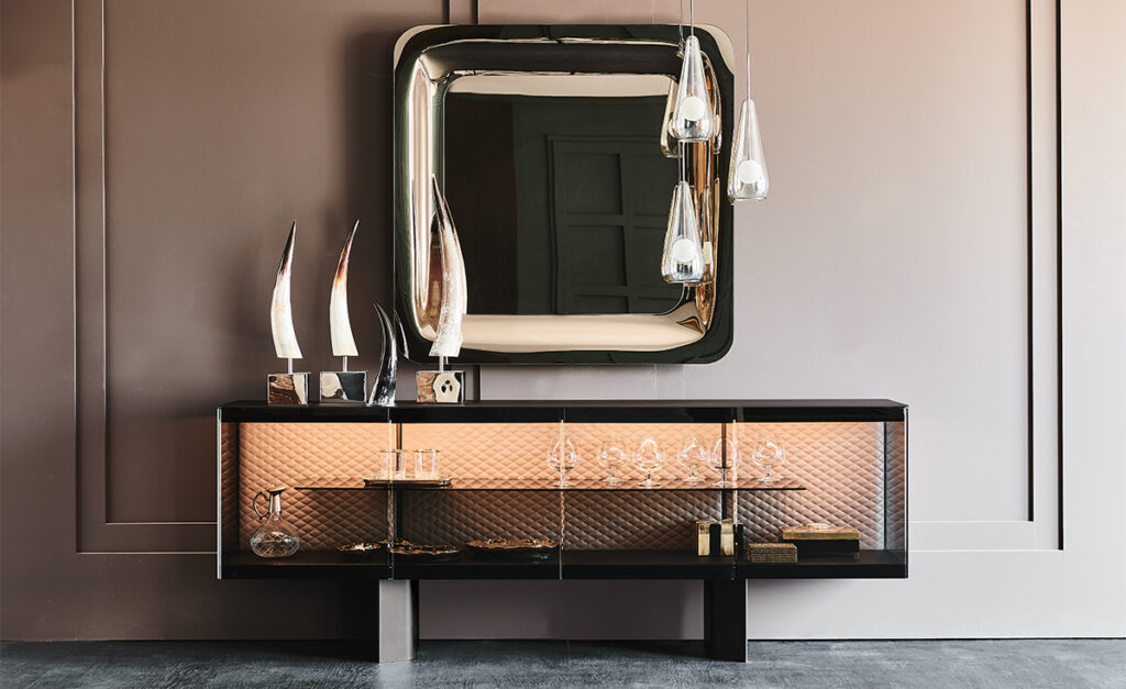 The most valuable items are displayed and preserved at once by the exquisite Boutique sideboard, conceived by Alberto Danese. The internal glass shelves, the quilted upholstered backrest, and the LED lights are all details designed to valorize the objects that are kept inside this design cabinet, that decorates the living area with refined taste. The Boutique modern sideboard collection consist of two 4-doors versions with different heights, and of the higher 3-shelves sideboard Boutique Alta.