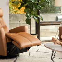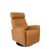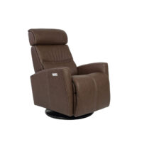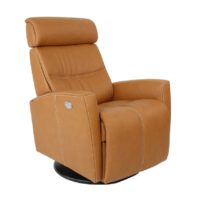 Scandinavian comfort with all of the features you could ask for. The Fjords Milan Swing Relaxer provides exceptional comfort through an angle and height adjustable headrest, high resiliency molded foam, luxurious leather and an easy-to-operate power reclining system. This chair swivels, glides and reclines with the touch of a button. Simply press the “open” button to extend the footrest and recline the back.* Choose from small and large sizes to achieve the perfect fit.