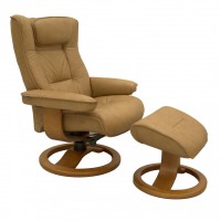 The Fjords Regent Recliner and Ottoman provide a supportive and comfortable experience. This ergonomic Norwegian design separates the footrest from the recliner to increase adjustability. This design allows the user to position the footrest in a way that supports the legs properly and increases back support. The chair reclines effortlessly by gently pushing your body weight backwards. A tension knob allows you to adjust the tension of the recline. The headrest adjusts manually by pulling the top of the chair forward or backward. High quality leather enhances the comfort of the chair and creates a beautiful, long-lasting recliner. Choose from a variety of leathers.