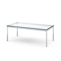 Consistent with all of her designs, the table has a spare, geometric presence that reflects the rational design approach Florence Knoll learned from Mies van der Rohe. With polished chrome plated steel base and a 5/8″ thick clear glass top, these simple, modern tables are timeless.