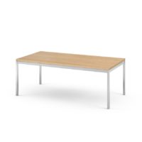 As skyscrapers rose up across America during the post-war boom, Florence Knoll saw it as her job to translate the vocabulary and rationale of the modern exterior to the interior space of the corporate office. Thus, unlike Saarinen and Bertoia, her designs were architectural in foundation, not sculptural. She scaled down the rhythm and details of modern architecture while humanizing them through color and texture. Her occasional table collection, designed in 1954 to complement her eponymous lounge collection, is a perfect example of her restrained, geometric approach to furniture, clearly derived from her favorite mentor, Mies van der Rohe.