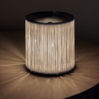 Its distinctive nylon fringes cascade gracefully from a diabolo-shaped aluminum base, where six lateral bulbs encircle the central core, while an additional bulb resides above, casting an enchanting 360º radiance through the fringes. This luminary masterpiece also creates an ethereal uplight, its glow dancing upon the polished aluminum, all within your control through a dual-button switch.