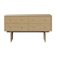 Understated sophistication, timeless aesthetics, and outstanding craftsmanship are the hallmarks of the highly practical Private Sideboard by Space Copenhagen. Inspired by antique Japanese furniture in both style and craft, this oak-veneered sideboard is elevated by two vertical legs, held together by a single horizontal beam, giving strength in structure and yet lightness in appearance. Available in brown/black or light-stained finishes, the body comprises four symmetrical soft-close drawers, each with antique brass finish metal handles. The long, slim top is an excellent surface for ornaments or artworks. Designed to fit snugly against the walls of a living room, dining room or bedroom, or even paired up and placed back-to-back, the Private Sideboard fits perfectly with the other elements from the collection. Classic design, excellent workmanship and immense versatility and functionality ensure that the Private Sideboard will be cherished more and more over time.