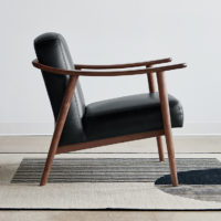 Solid wood frame featuring custom bent armrests and mortise and tenon joints is crafted from walnut or ash. Oil-based clear coat finish.