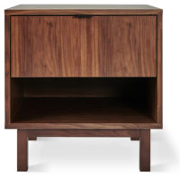 Bring some mid-century modern vibes into your home with the Belmont End Table by Gus* Modern. This architecturally inspired end table design features clean lines and warm, natural walnut. A simple black metal handle completes the look. Whether you are looking for the perfect nightstand or a little extra storage in your living room – Belmont has you covered!