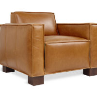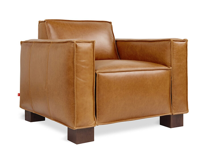 Is it modern, architectural or vintage? The Gus Cabot Chair is all of the above. This blocky leather arm chair invites you to sit down. Top grain saddle leather covers this chair, which has both a tight back and a tight seat. No cushions moving around here. French seams give the Cabot Chair a structured, yet relaxed look. Block feet in a walnut stain support this stately chair and create just a little bit of “lightness”. Plastic bumpers on the bottom of the wood legs help to protect hard floors. Sync into this modern leather club chair – whether it’s to read a book or sip a drink.