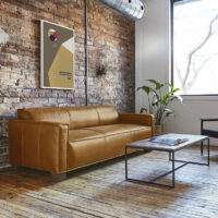 Is it modern, architectural or vintage? The Gus Cabot Sofa is all of the above. This blocky leather sofa invites you to sit down. Top grain saddle leather covers this sofa that has both a tight back and a tight seat. No cushions moving around here. French seams give the Cabot Sofa a structured, yet relaxed look. Block feet in a walnut stain support this stately sofa and create just a little bit of “lightness”. Plastic bumpers on the bottom of the wood legs help to protect hard floors. Sync into this modern leather sofa – whether it’s to read a book or take a long nap.