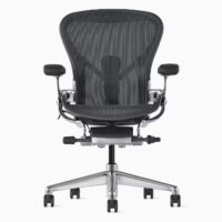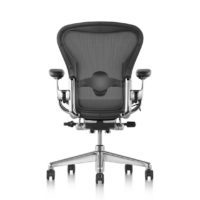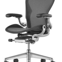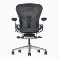 Remastered and reintroduced in 2016, the Herman Miller Aeron Chair offers more support and functionality than ever before. The new version of the Aeron Chair features more user friendly adjustments, new color options and redesigned support for your entire body. The graphite version of the Aeron Chair has an almost black frame and base with a matching 8Z Pellicle™ fabric seat and back. A polished aluminum base and chassis (part of frame that supports arms and seat) are also available.
