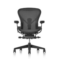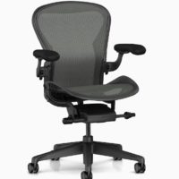 Remastered and reintroduced in 2016, the Herman Miller Aeron Chair offers more support and functionality than ever before. The new version of the Aeron Chair features more user friendly adjustments, new color options and redesigned support for your entire body. The graphite version of the Aeron Chair has an almost black frame and base with a matching 8Z Pellicle™ fabric seat and back. A polished aluminum base and chassis (part of frame that supports arms and seat) are also available.