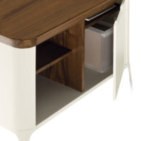 The warmth of a walnut wood frame contrasts against the white aluminum surface and tapered legs. Cutouts for cords and cables free the surface of clutter from your charging devices, and slender drawers help to organize papers. The Airia Media Cabinet provides additional storage and display capability. Such features make Airia a timeless piece that supports contemporary needs.
