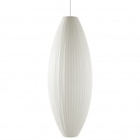 This classic lamp is part of the Bubble Lamp Collection by George Nelson, which was originally designed in 1952. This lovely cigar-shaped lamp will create a warm, glowing light in your space. Choose from four sizes. This classic, yet modern pendant comes with a 6 foot white cord and a brushed nickel-plated steel ceiling plate that is 5.25″ in diameter. A white shade creates a soft, even glowing light. The George Nelson Bubble Lamps are available in a number of additional shapes.