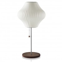 This classic lamp is part of the Bubble Lamp Collection by George Nelson, which was originally designed in 1952. This lovely pear-shaped lamp will create a warm, glowing light in your space. A brushed metal stem supports this elegant light and a brushed metal or walnut wood disc provides a solid base. This Pear® Lotus® Table Lamp is ideal for bedrooms, living rooms and any other corner of the house that needs to be brought to life. The stem and base is constructed of nickel-plated steel. A white shade creates a soft, even glowing light. An on/off pull chain has a walnut ball to add warmth and convenience. Comes with a 90-inch long cord has a plug on the end of it.