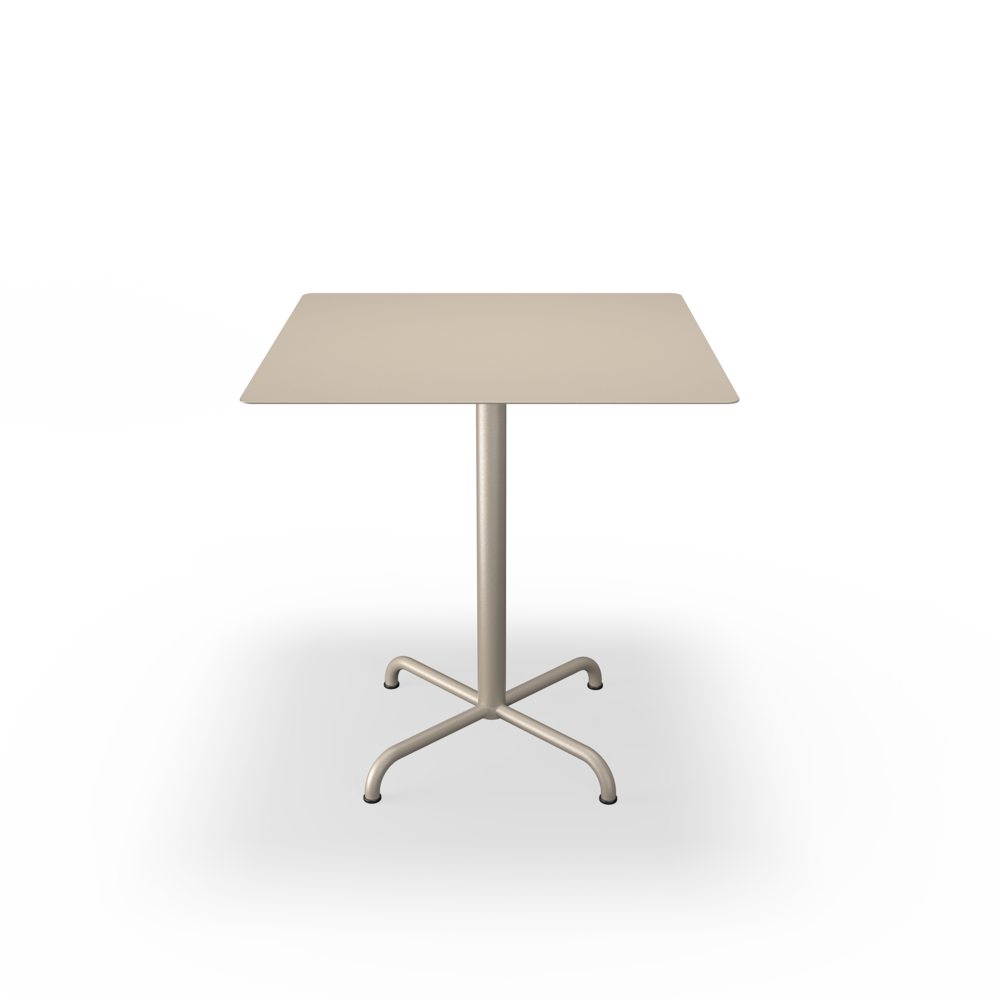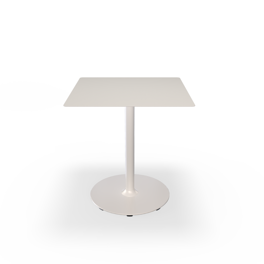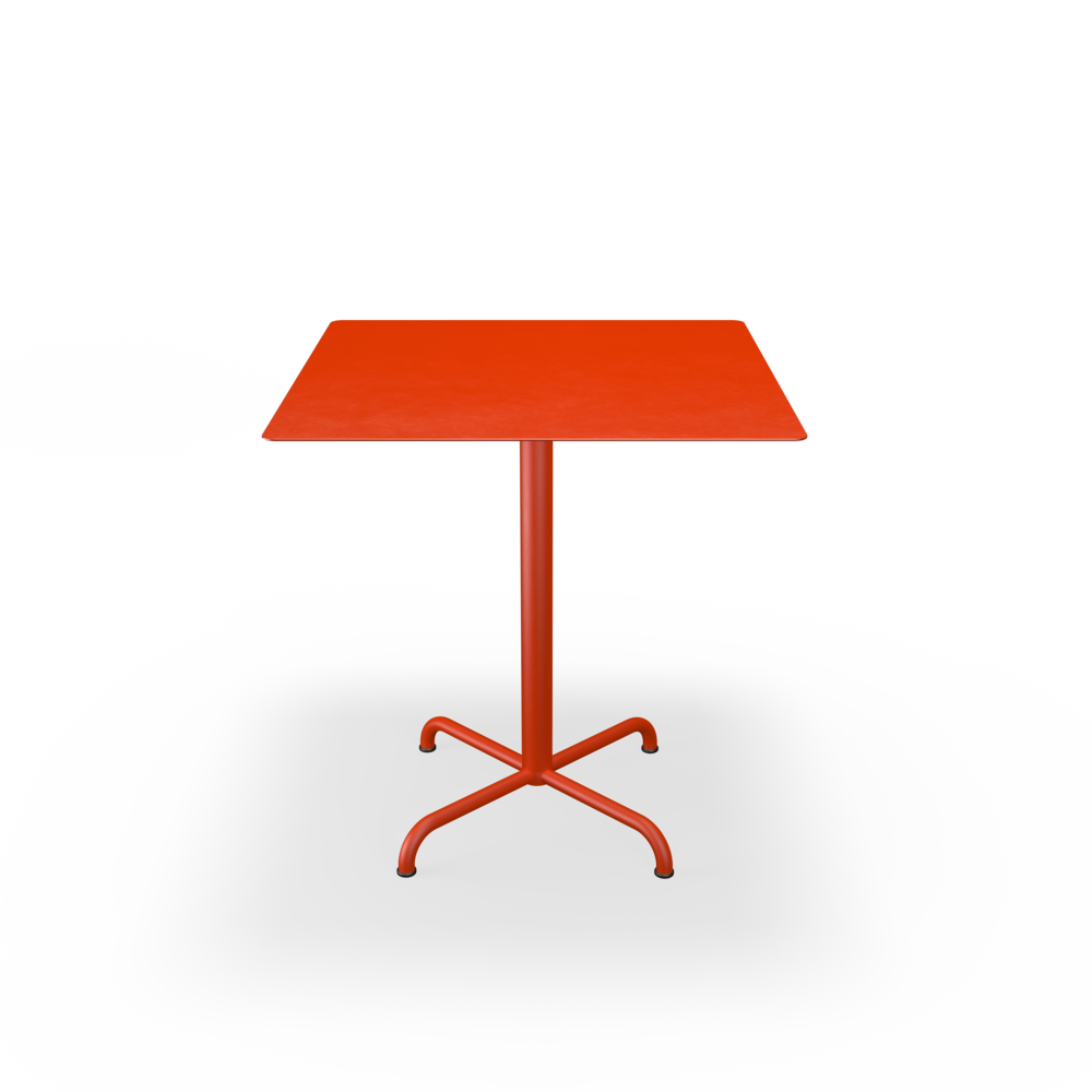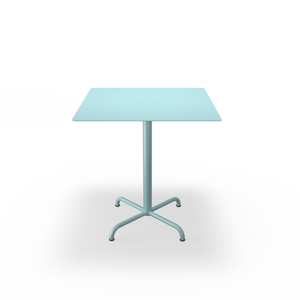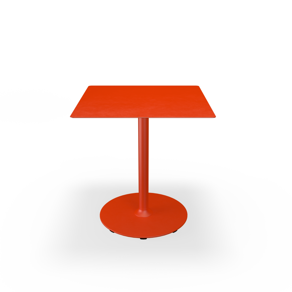 The tabletops are made from resilient aluminum, complemented by steel bases with a soft matte surface achieved through powder coating.