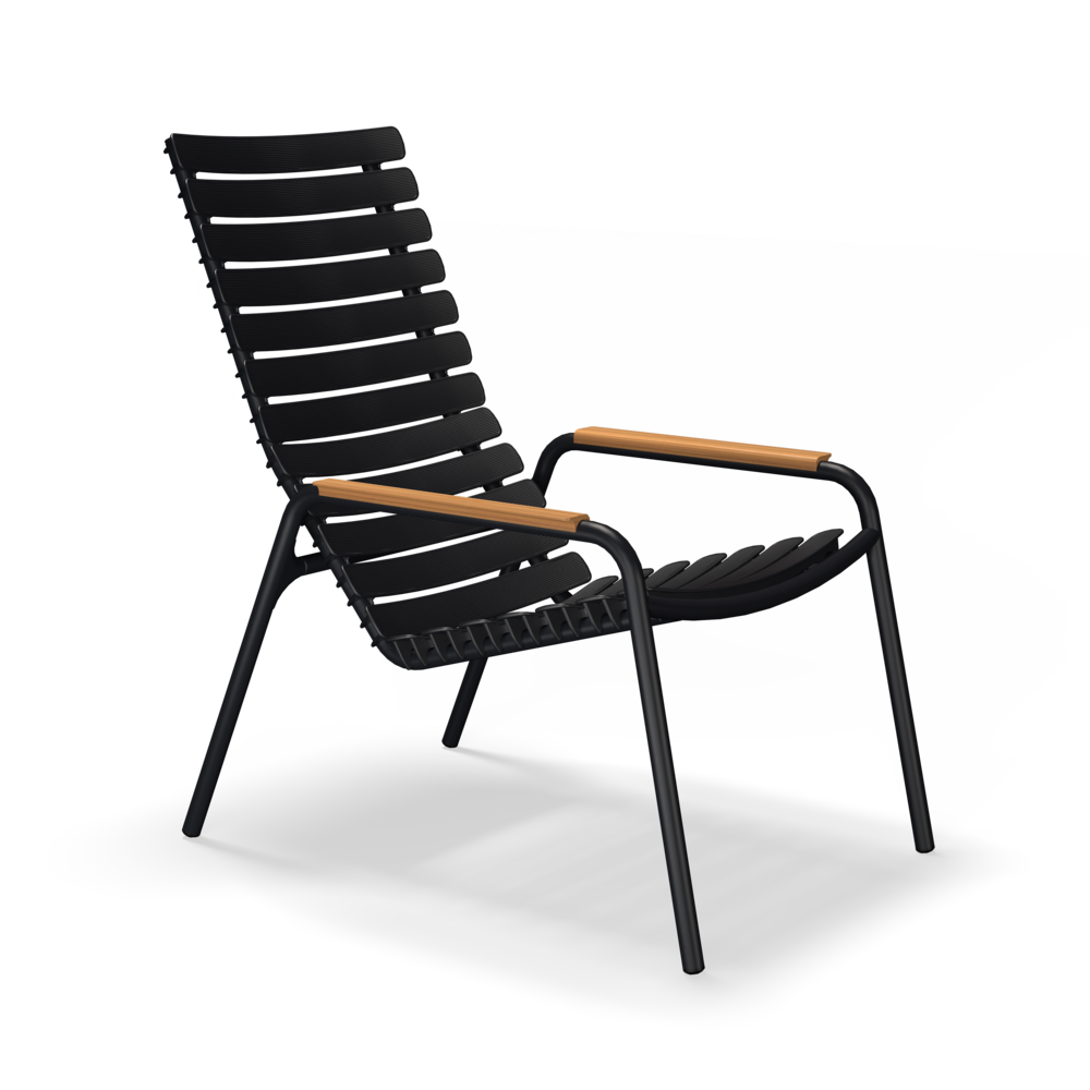 ReCLIPS Lounge chair comes in black with the choice of armrests in bamboo or aluminum. The aluminum frame combined with the UV protected plastic lamellas, keeping maintenance to a minimum.