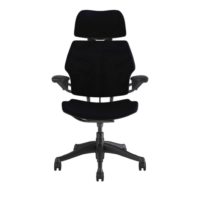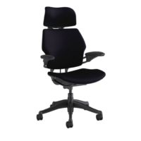 This chair as available through the Quickship program comes with adjustable duron arms, a graphite base, a standard seat pan and 5″ adjustable seat height, 3″ casters for carpet, a standard foam seat and base, and is available in Corde 4 Black fabric. For chair variations, please see our Humanscale Freedom Chair with Headrest page.