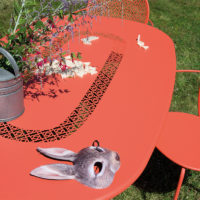 The oval table, with a generous rounded shape is ideal when space is at a premium: it can seat 6 guests who can enjoy a festive meal while being able to see and talk to each one another. While its main original feature is its shape, the Lorette oval table also stands out with its perforated top. The perforations, which are a highlight of this collection, give the table an incredibly chic stylish look. The lattice work pattern can still be seen even when the table is laid, like a table runner. The straight feet do not get in the way of guests’ legs. They are flared slanted to stand firmly on the grass, and the use of steel means that this beautiful piece of furniture will stand the test of time.