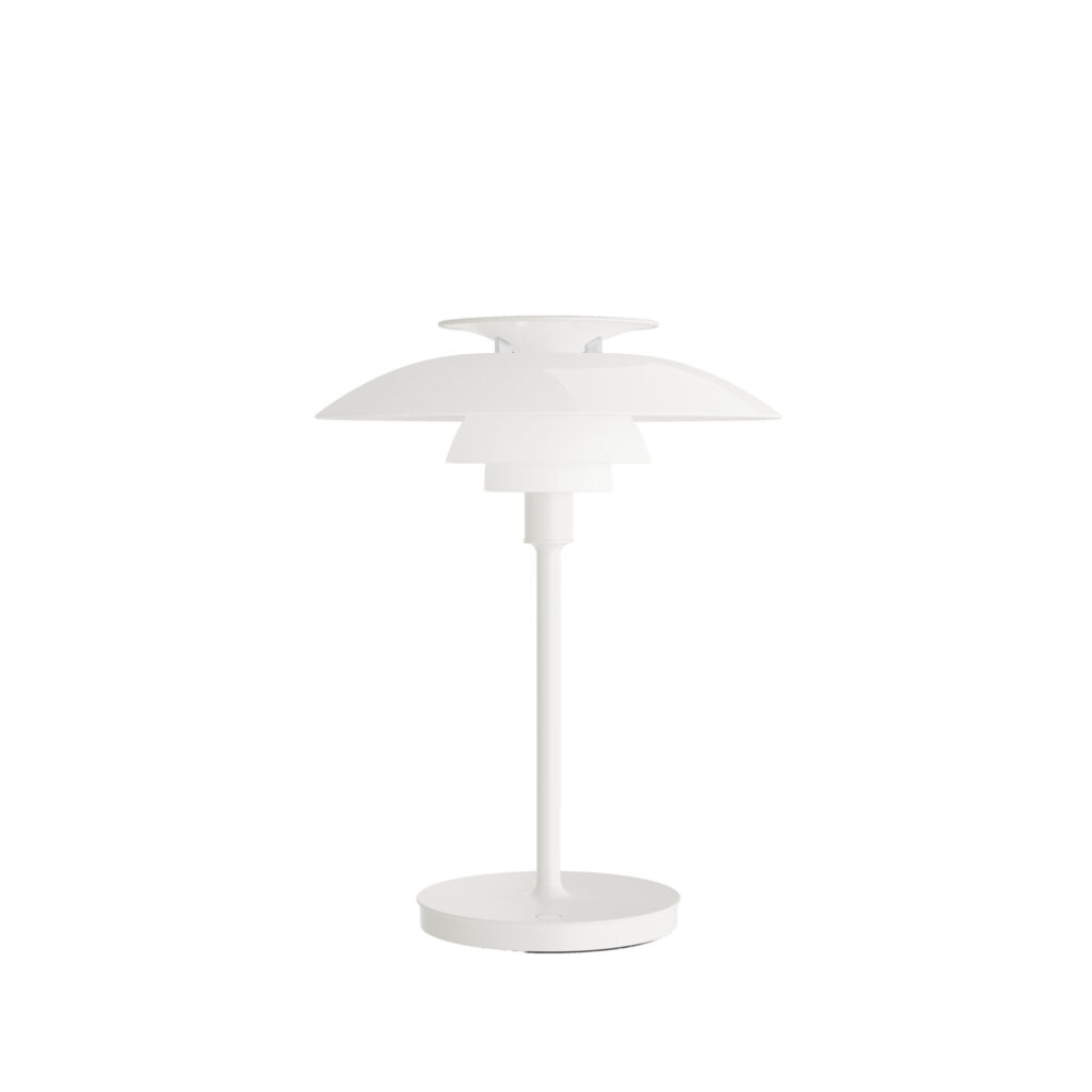 Take the iconic PH 80 Portable Lamp with you wherever you go and enjoy the warm, inviting glow of the classic three-shade system PH in white opal acrylic.