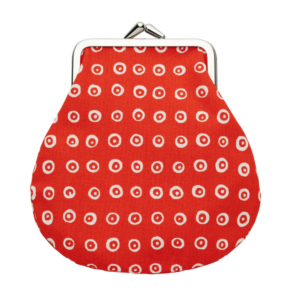 The Marimekko Pieni Kukkaro Purse is made of 100% cotton. It features the Karakola pattern printed in red and white. The purse has a metal frame, with a retro-style metal clasp that is easy to snap open and shut. A multipurpose classic, ideal for money, credit cards, and other small things.