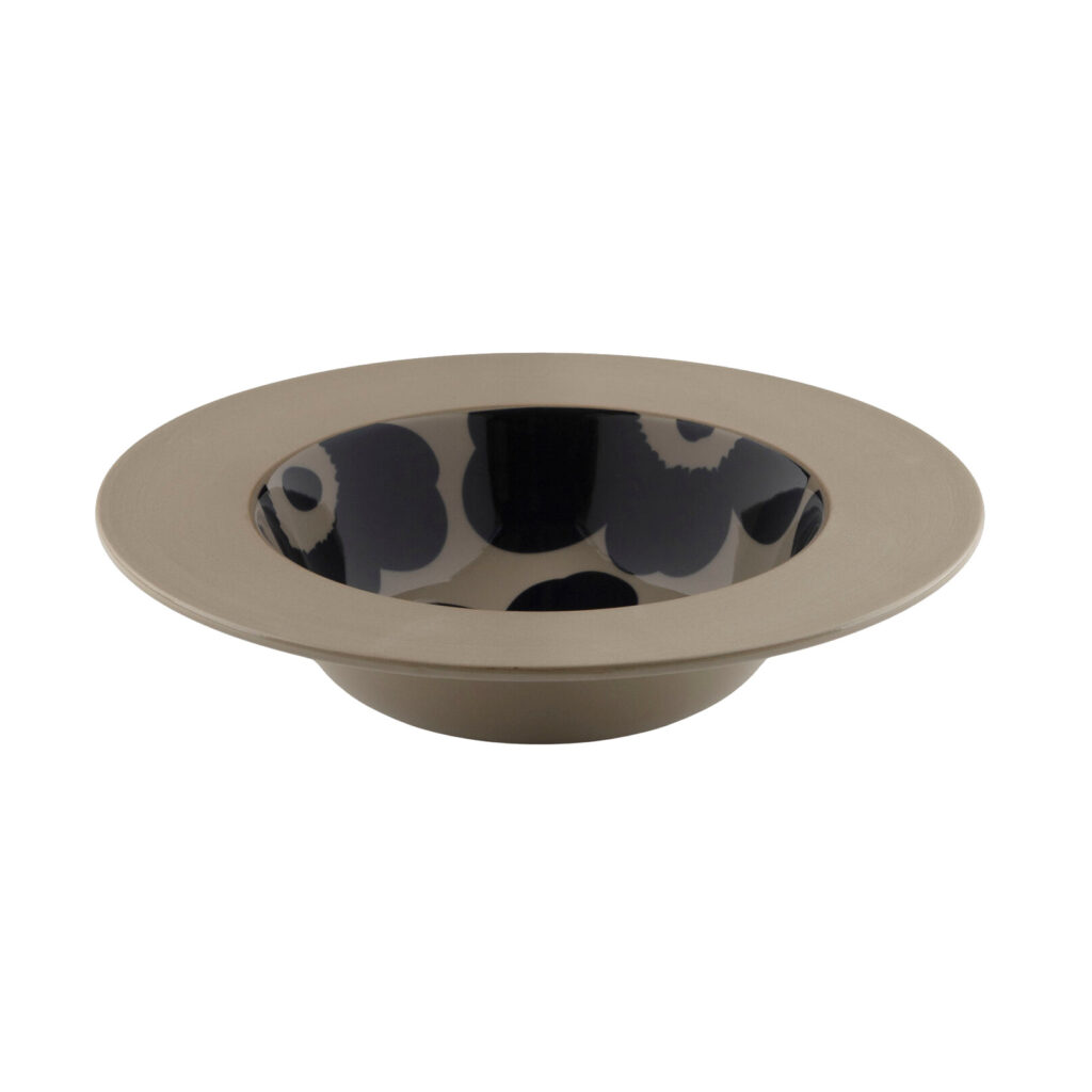 The Marimekko Oiva Unikko Deep Plate features their famous poppy pattern in dark blue. Made from durable brown stoneware, the bowl has a clear glaze all over except on the top side of its rim which is left unglazed and naturally rough. It is dishwasher, microwave, oven and freezer safe.