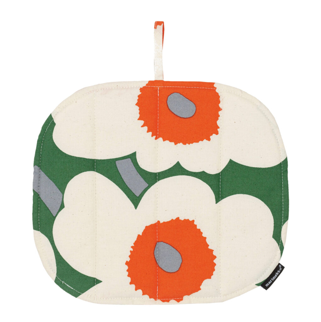 The Marimekko Pot Holder has a padded filling and a hanging loop. Its decorative fabric is made from 100% cotton, printed in the Pieni Unikko pattern in green, orange and cotton.