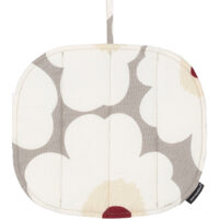 The Marimekko Pot Holder has a padded filling and a hanging loop. Its decorative fabric is made from 100% cotton, printed in the Pieni Unikko pattern in dark red, light grey, white and yellow.