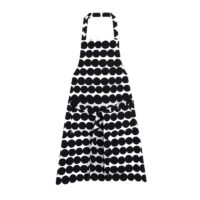 The Marimekko Rasymatto Apron is made from 100% cotton. It has a front pocket, an adjustable neck strap, and two waist straps that can be tied together at the back. The pattern, designed by Maija Louekari, represents the everyday beauty of a simple rag rug on the floor of an allotment garden cottage. It is based on themes like sustainable living and the joy of working with your hands.
