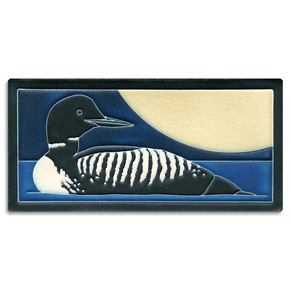 The Loon is depicted in this decorative tile inspired by Northern Michigan wildlife. Motawi uses a raised-line technique when making their decorative ceramic tiles. The raised ridges create the detailed design and contain the colorful glaze. Handcrafted in Ann Arbor, Michigan.