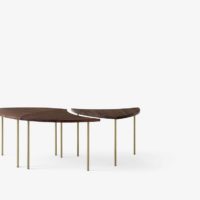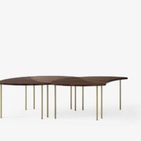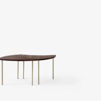 The Pinwheel table was designed in 1953 by Hvidt & Mølgaard. This timeless end table features a simple fin shaped top in either oak or walnut and satin brass legs. Pinwheel is a dynamic standalone piece, but it also works well in multiples. Six tables can be arranged in a circle, creating a pinwheel shape, while two or three tables can be grouped together to create small or medium sized coffee tables.