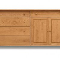 Simple with a subtle Shaker influence, the Sarah Buffet by Copeland blends with traditional and modern furnishings. Made of solid Cherry hardwood, the Sarah features a beautiful wood grain with the option of several stain finishes. The Sarah 5 Drawer/2 Door Buffet provides a huge amount of storage space to store all of your china, serving pieces, linens and more. Drawers provide storage for silverware while adjustable shelving behind the doors can store large serving pieces or china. Doors can be on the left or right side of this buffet. For smaller spaces, check out the Sarah 1 Drawer/2 Door Buffet. The Sarah Dining Series offers many coordinating dining table and chair options. Many hardware options available.