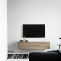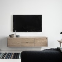Cords from your TV can be led through an opening in the center of the top of this TV stand. Openings allow you to run cords through one compartment to the next. This unique entertainment stand can be mounted to the wall or free standing. Wall mounting hardware and a plinth base are both included. Choose from several stunning Scandinavian wood finishes. A longer version of this unit is also available.