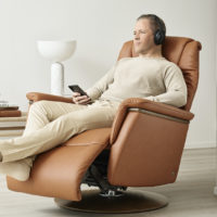 Stressless® Max has state-of-the-art technology underneath the supple, voluminous shapes. Soft and calming rocking motions offer instant comfort as you sit down. The Stressless Max relaxer has motorised adjustment of the headrest, backrest and footrest. The support can be adjusted individually to your needs – or at the touch of a button, automatically recline into a comfortable resting position.