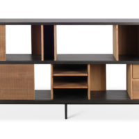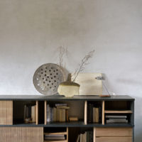 The Oscar sideboard in solid teak by Alain van Havre is the perfect multi-tasker: its open spaces can be used to exhibit personal objects, whereas the sliding doors offer the option of organizing documents out of sight. Notice the exceptional grooves in the doors: each narrow groove was carefully hand carved, making every Oscar piece unique.