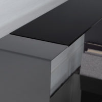 It is available in a variety of water-based UV-cured finishes. - Starphire tempered glass top with a flat polished edge